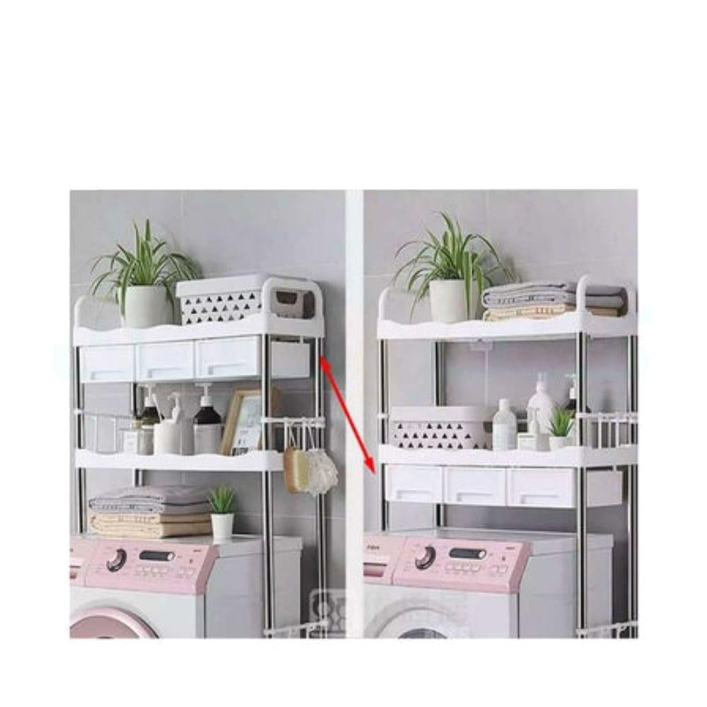 رف تخزين الغسالة مزود بأدراج، تنظيم وتخزين فعال لغرفة الحمام، تصميم أنيق وعصري، لون أبيض.