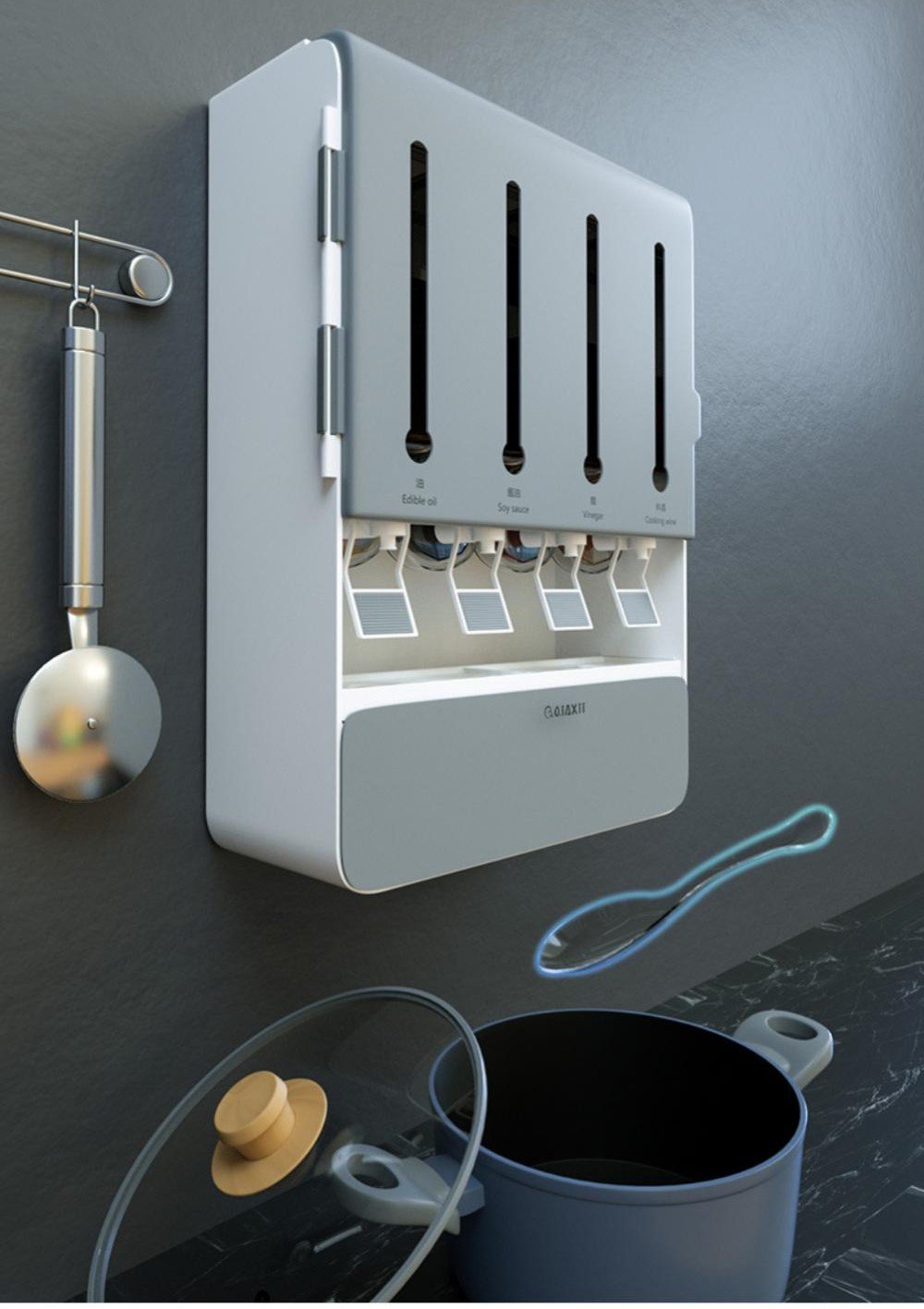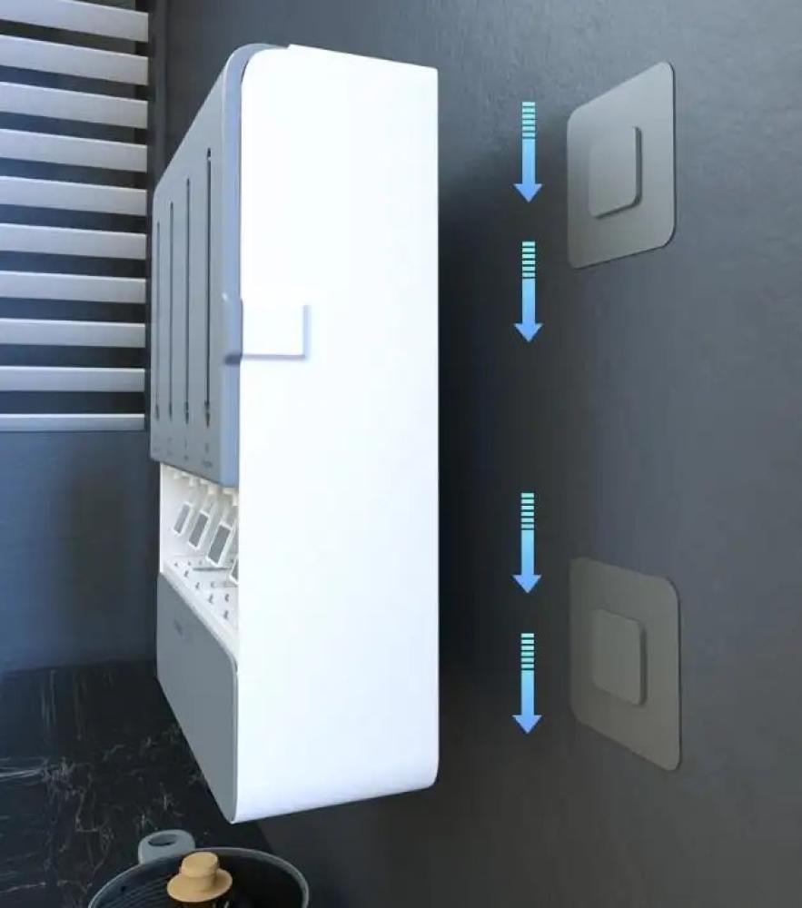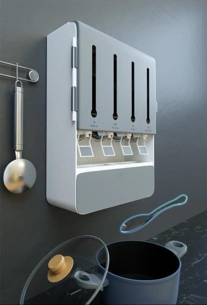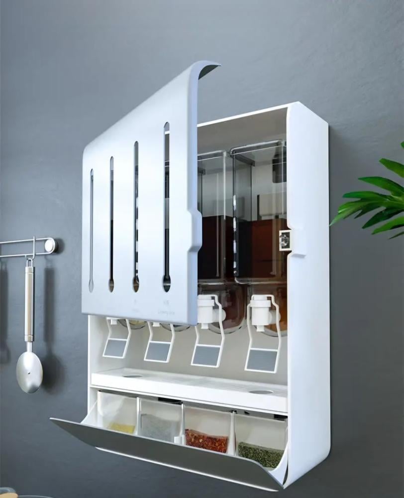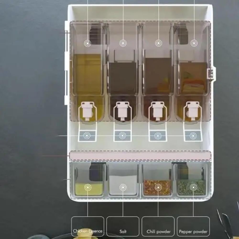 صندوق التوابل عبارة عن موزع للتوابل و السوائل الضرورية للطبخ لتكون بين يديك، سهل التثبيت على جميع الاسطح عن طريق الثوابت المرفقة ذاتية اللصق و سهلة التركيب. تتميز بتصميم عملي يسهل الوصول للتوابل والزيوت أثناء الطبخ و تمكن من الحفاض على مواد الطبخ لأطول عمر ممكن .