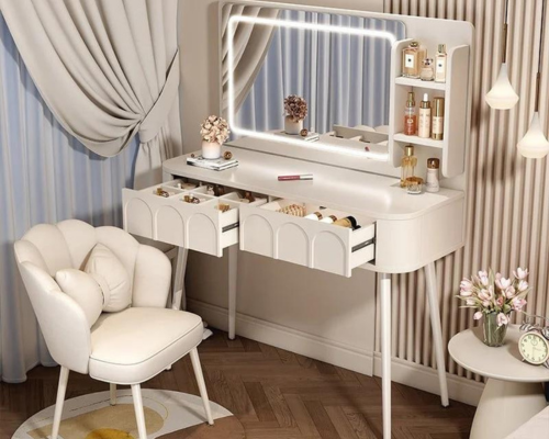 - تسريحة خشبية راقية معاصرة بلون أبيض مصنوعة من خشب عالي الجودة تضم درجين ومرآة وتتميز بمساحة واسعة كافية لجميع المستلزمات.