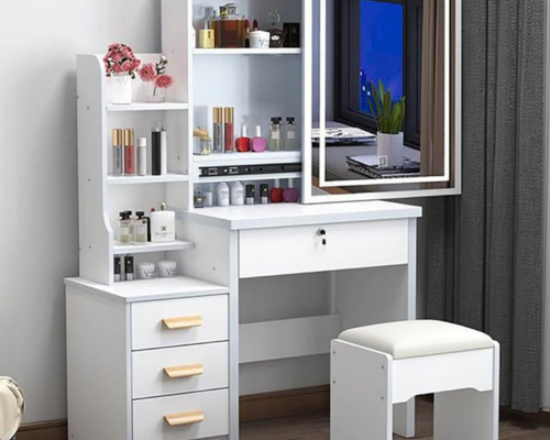 • تسريحة بنمط عصري وانيق وهي من أدوات المنزل للديكور الحديث مصنوعة من مواد عالية الجودة تضم مرآة أنيقة وأربع أدراج ورفين للتخزين ويرفق بها مقعد خشبي مع وسادة مريحة.