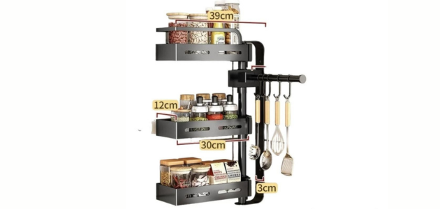- منظم توابل مكون من ثلاثة رفوف يمكن تخزين فيه التوابل المختلفة والزيوت وأدوات المطبخ الأساسية، يتكون من قاعدة متينة مستقرة وثلاثة طبقات العلوية منها على شكل خزانة بباب شفاف يمكن وضع مستلزمات المطبخ فوقها.